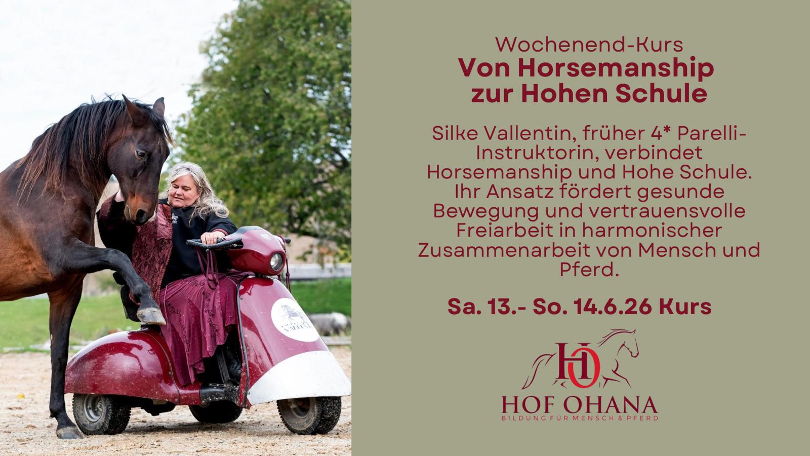 Von Horsemanship zur Hohen Schule – Kurs mit Silke Vallentin Juni 13 13.06.2026 | 09:00 bis 14.06.2026 | 17:00 CEST Von Horsemanship zur Hohen Schule – Kurs mit Silke Vallentin